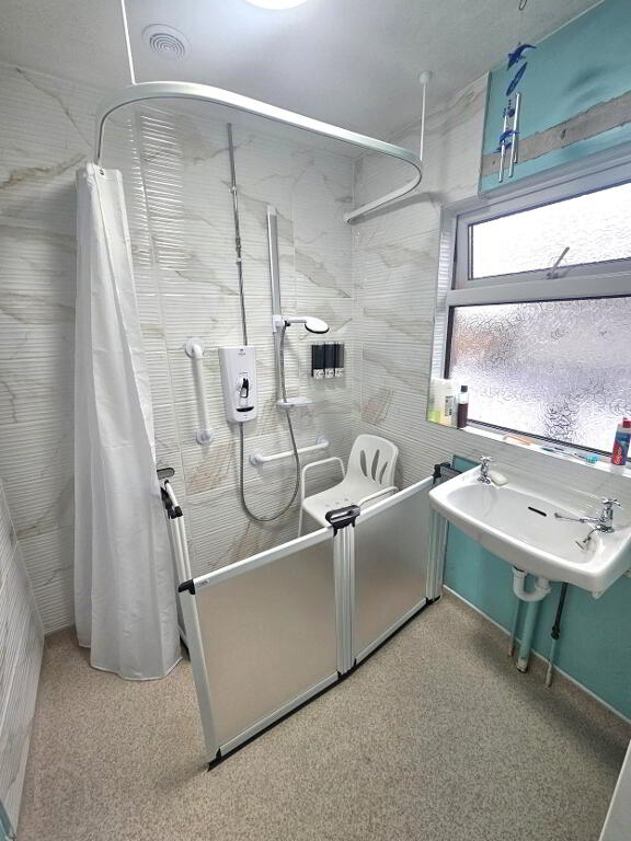 Having non slip vinyl flooring, part tiled walls, wash hand basin, Mira electric shower folding shower screen door with shower curtain, extractor fan & single panel radiator