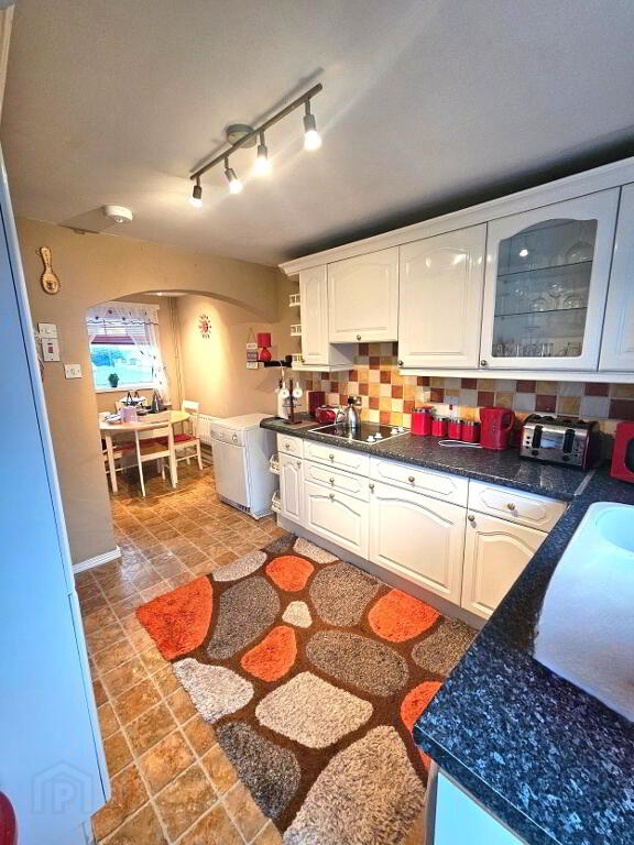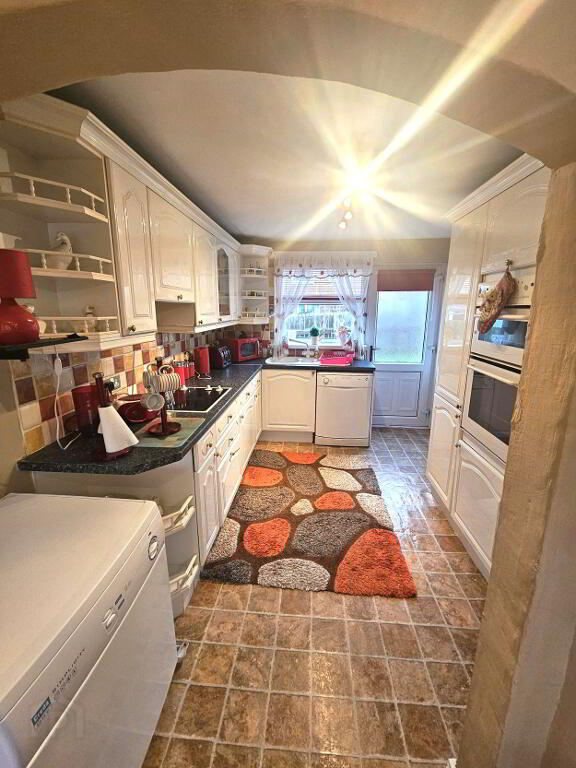Having tile effect vinyl flooring, high & low level units with tiled splashback between, white 1 ½ bowl sink with drainer, plumbed for washing machine, plumbed for dishwasher, space for fridge freezer, integrated double oven, integrated hob, 2x venetian blinds, roller blind, understair storage cupboard & single panel radiator