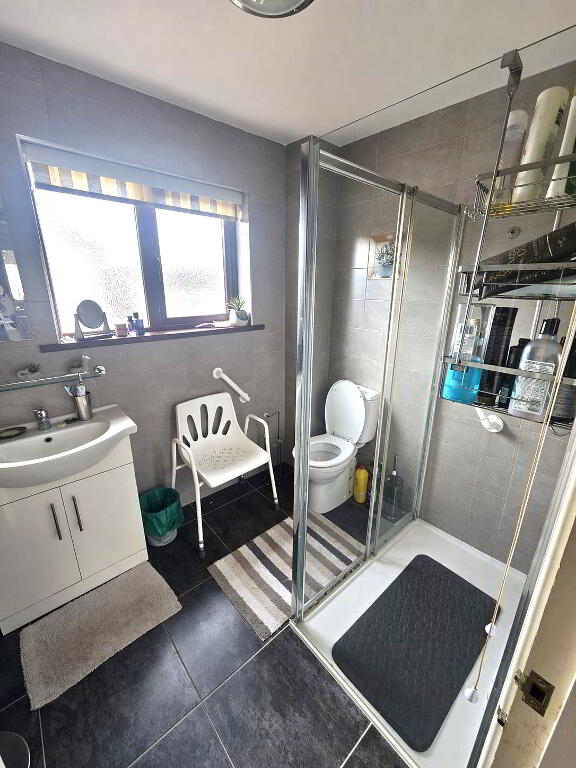 Having tiled flooring & fully tiled walls, fully tiled shower cubical with electric shower, low flush WC, wash hand basin with vanity below, extractor fan & single panel radiator